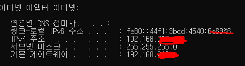 이것은 우리 집의 IP 주소 정보이다 맨 앞 주소가 192~223의 C 클래스이고 서브넷 마스크는255.255.255.0인 걸 확인할 수 있다.